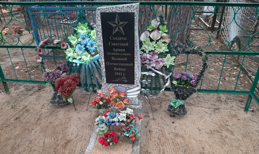 Кладбище небольшое по размеру, но, в традициях сельской местности, ухоженное и аккуратное. Очень много захоронений с одинаковыми фамилиями. Братская могила расположена примерно в центре, обозначена хорошо читаемым знаком о государственном учете. На захоронении есть цветы и венки. Проведена уборка братской могилы, а также небольшой ремонт деревянного креста по соседству. Захоронений Санковичей очень много, на одном — портреты мужчины в военной форме и женщины.