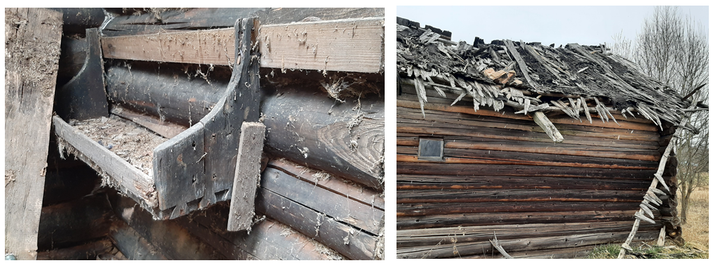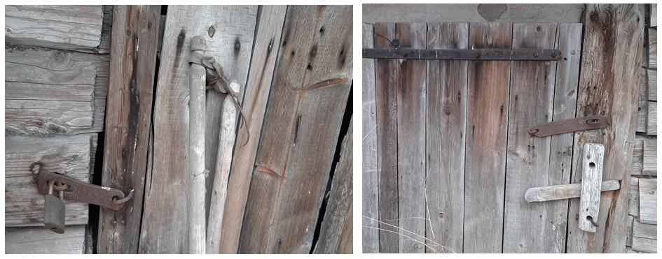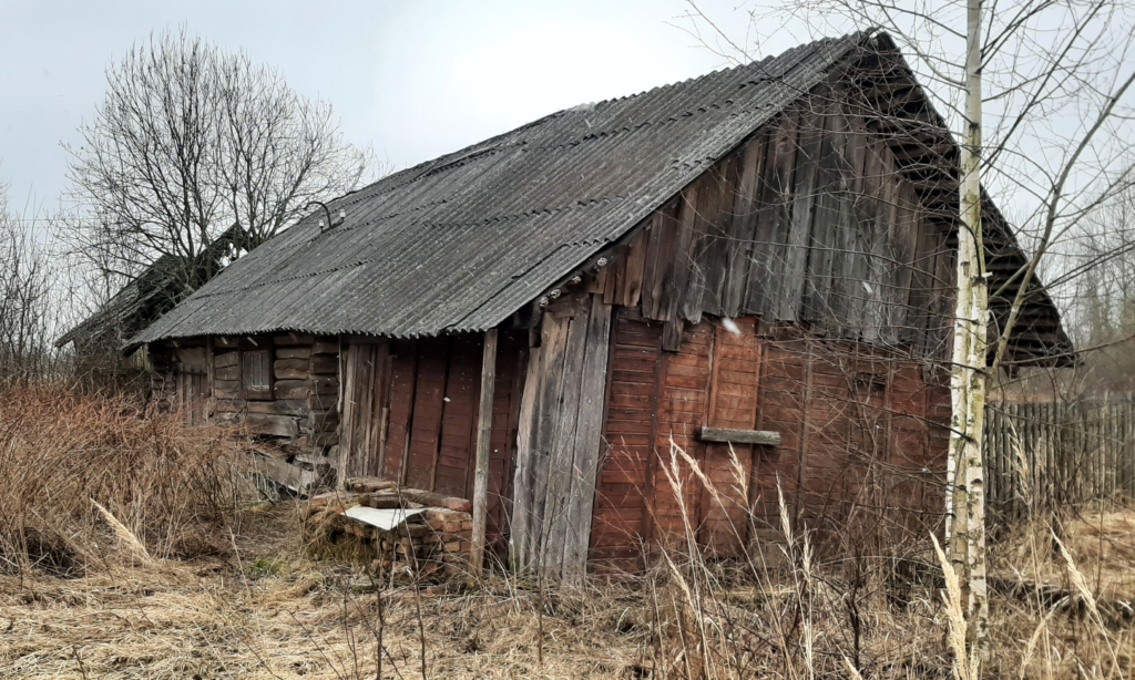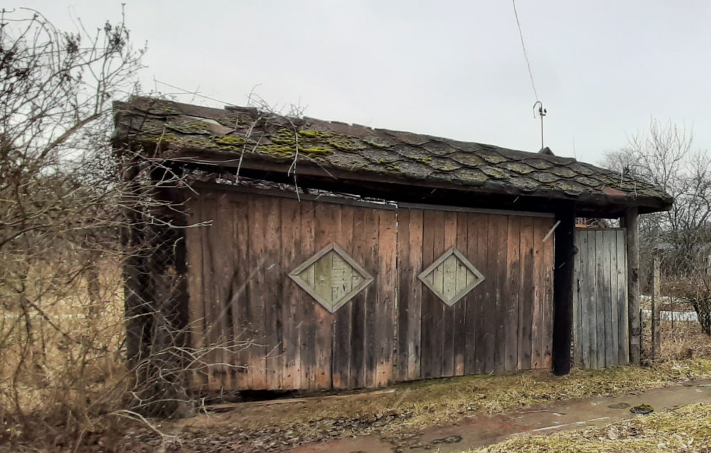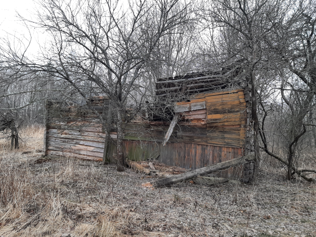 Свернув на боковую улицу, заметили старый дом, часть забора вокруг которого отсутствовала. Цепкий малинник, бурьян по пояс, узловатые ветки доживающих свой век без хозяйской заботы яблонь. Осматривая дом заметили достаточно старинные предметы: цеп для обмолота зерна, ворота в хлев со старыми петлями, свисающий из-под крыши ремень, напоминающий элемент упряжи.