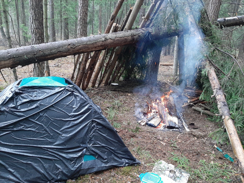 С местом для привала очень повезло. Прошедшая недавно непогода оставила после себя поваленные деревья. У одного из них и остановились, поставив ветрозащиту уголком. Палатку укрыли мешками, лапник срезали у вывернутой с корнем ели. Апробация палатки показала очень посредственное ее качество: тент прогорал от малейшей искры, очень легко пропускал влагу, совершенно не держал тепло. Конечно, ожидать другого от самой дешевой палатки было бы наивно, но полученный опыт показал, что для двухдневного выезда у проекта ресурсов пока недостостаточно.