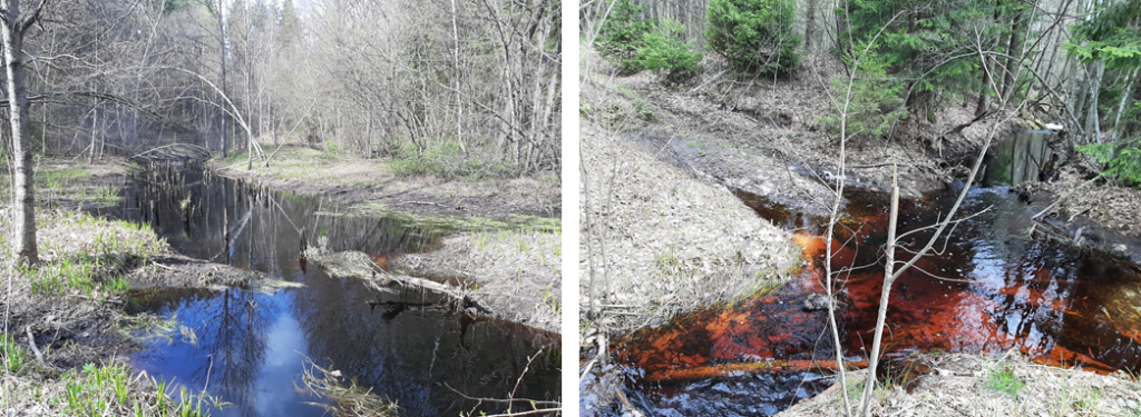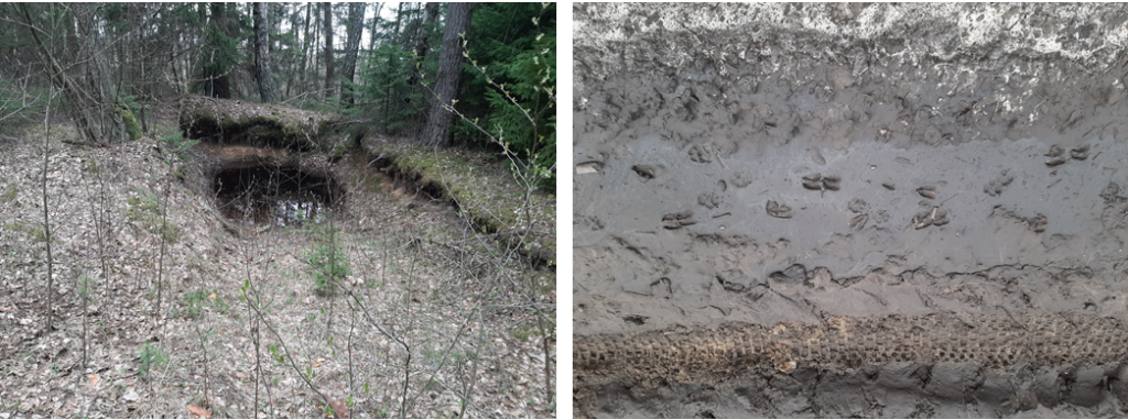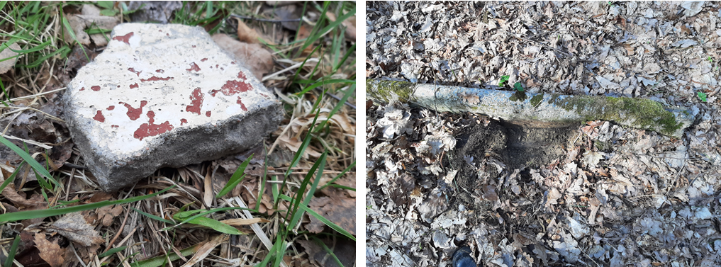 Помимо основных поисковых объектов замечали едва уловимые следы бывшего присутствия в этих местах человека. На дороге обнаружен фрагмент стены с остатками красной штукатурки, в лесу встречаются фрагменты столбов.