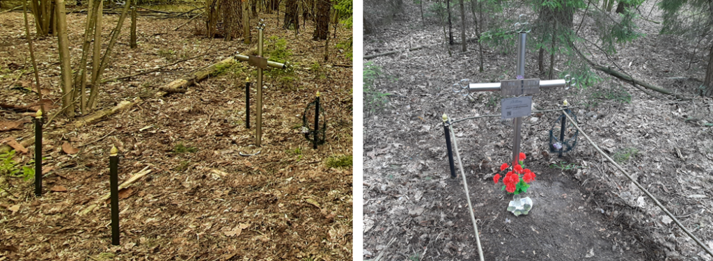 В состоянии Креста изменений не произошло: цепи не появились, свежих цветов нет, старый венок на том же месте, ленточка откинута за табличку ровно так, как мы ее оставили. Видимо, с нашего визита посетителей здесь не было. В рамках акции «(Не)забытые» проведено благоустройство места Памяти: убрана листва, проведена очистка креста и таблички от пыли и грязи, из веток сооружена временная замена ограды. Во время благоустройства под слоем листвы обнаружена маленькая рамочка для фотографии. Самого фото не обнаружено. Вероятно, его не пощадило время.