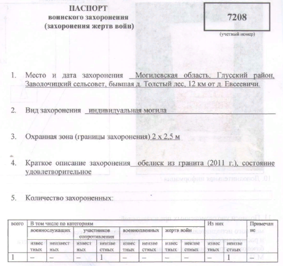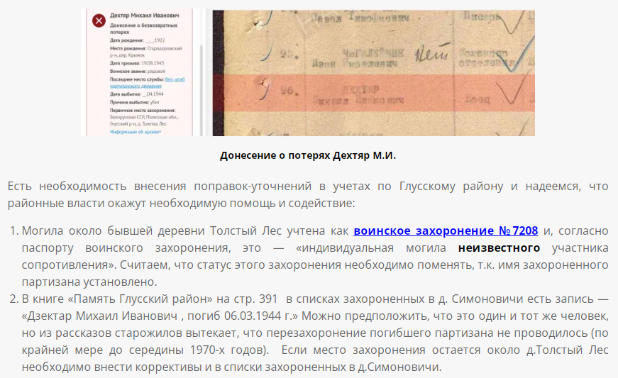 На захоронении партизана Дехтяра Михаила есть две таблички о государственном учете: пластиковая на калитке, стандартная — сзади памятника. Примечательно, но в паспорте, датированном 29.06.2018 г. указание имени захороненного отсутствует, хотя в электронного книге Памяти Осиповичского района опубликована целая статья на основе воспоминаний Ирины Шимчик о погибшем.