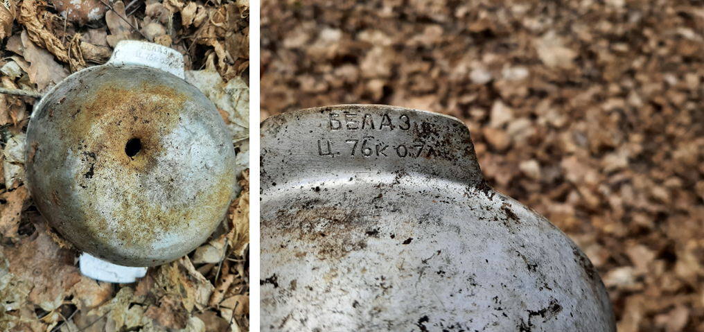 Во время уборки захоронения рядом обнаружена алюминиевая простреленная миска с клеймом «БЕЛАЗ» времен СССР объема 0,7 литра.