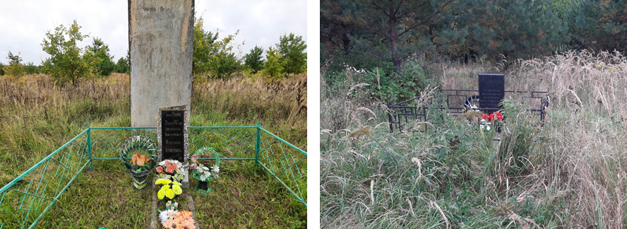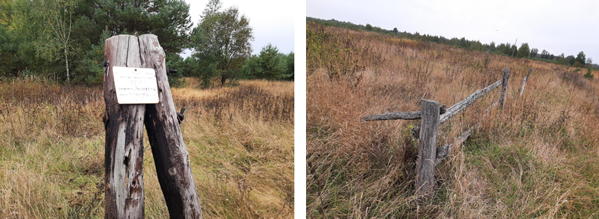 В окрестностях кладбища было замечено большое количество оврагов и камней, в поле — рукотворная конструкция с выцветшей табличкой, а также фрагмент ограды и в отдалении — еще столб. Подходить к столбу не стали: насекомые в поле атакуют очень массово.