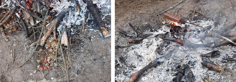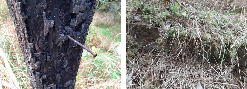 Более тщательное обследование территории у колодца позволило обнаружить новые объекты. Позади колодца, буквально в нескольких метрах, был найден обгоревший с одной стороны столб. Обугленная поверхность столба позволяет сделать предположение о том, насколько сильным было пламя. Буквально позади скамейки в траве был замечен сохранившийся фундамент.