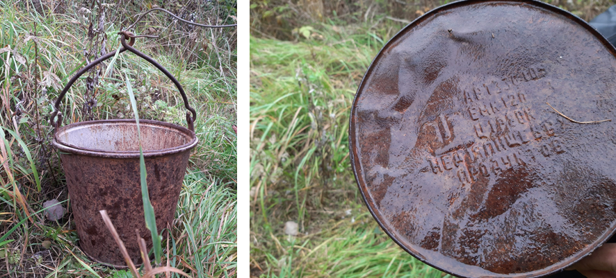 Синий колодец по-прежнему выглядит очень достойно. Проверили его на работоспособность: набрали ведро воды. Сама вода немного мутная, но посторонних предметов или запаха не обнаружили. Намочив поверхность ведра, обнаружили на дне надписи.