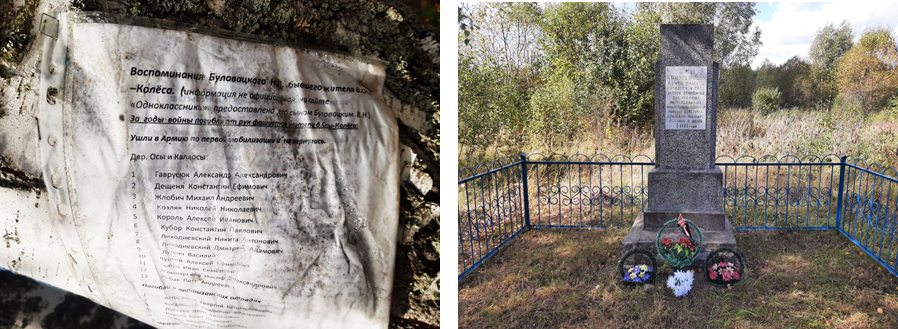 Самый отдаленный объект выезда, памятник Осам-Колесам, нашли достаточно быстро. Сначала дорога просматривалась хорошо, и только за высоковольтной ЛЭП затерялась в траве, но ориентир в виде группы берез был заметен сразу. Несмотря на отдаленность памятника от населенных пунктов, само захоронение выглядит аккуратно. Таблички с указанием улиц в траве или зарослях не нашли, зато неприятно удивил мусор, брошенный после благоустройства. Информация, оставленная в файле на березе очень пострадала. Внутрь файла легко попала вода.
