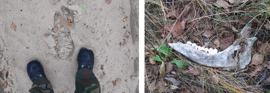 На второй день в полной мере ощутили переменчивость погоды. Раннее утро еще порадовало отсутствием ветра и осадков, но на небо уже затянуло плотной серой пеленой. Позавтракали, отложив кофе до лучших времен, и снялись с лагеря. По дороге к Межному в полной мере убедились, насколько высока вероятность столкновений с дикими животными. Поверх наших следов уже располагались отпечатки лосиных копыт. Не обошлось и без обнаруженных костей.