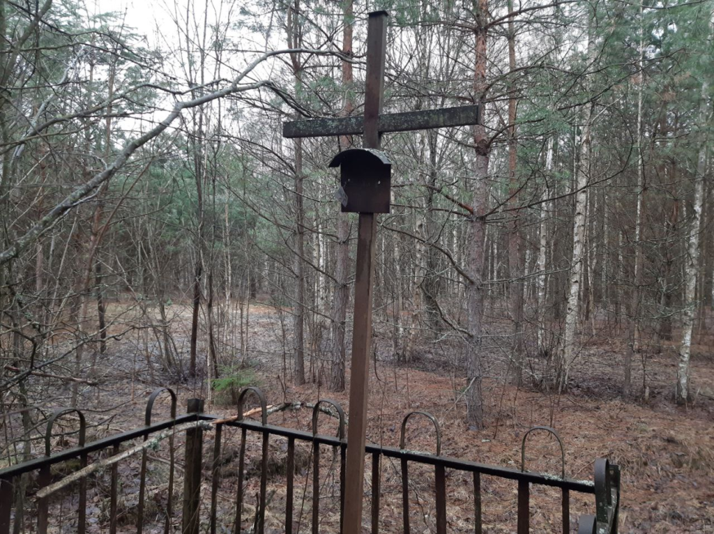Совсем рядом с дорогой был замечен железный крест с оградой. На покрытой ржавчиной табличке надписи отсутствуют, к самой табличке проволокой привязана погнутая солдатская пряжка (предположительно 80-90-х годов). На могиле лежат ветки, много листьев, в углу растет дерево. Следов посещения людей нет: ни цветов, ни предметов. Осмотр местности других объектов не выявил. Осмотрев захоронение, двинулись дальше. Решив обследовать мелиоративный канал, были вынуждены прервать поиск, наткнувшись на последствия волчьей трапезы. Отошли обратно к дороге. Обследование территории с другой стороны урочища выявило наличие старых плодовых деревьев. Вглубь молодых посадок не пошли из соображений безопасности.
