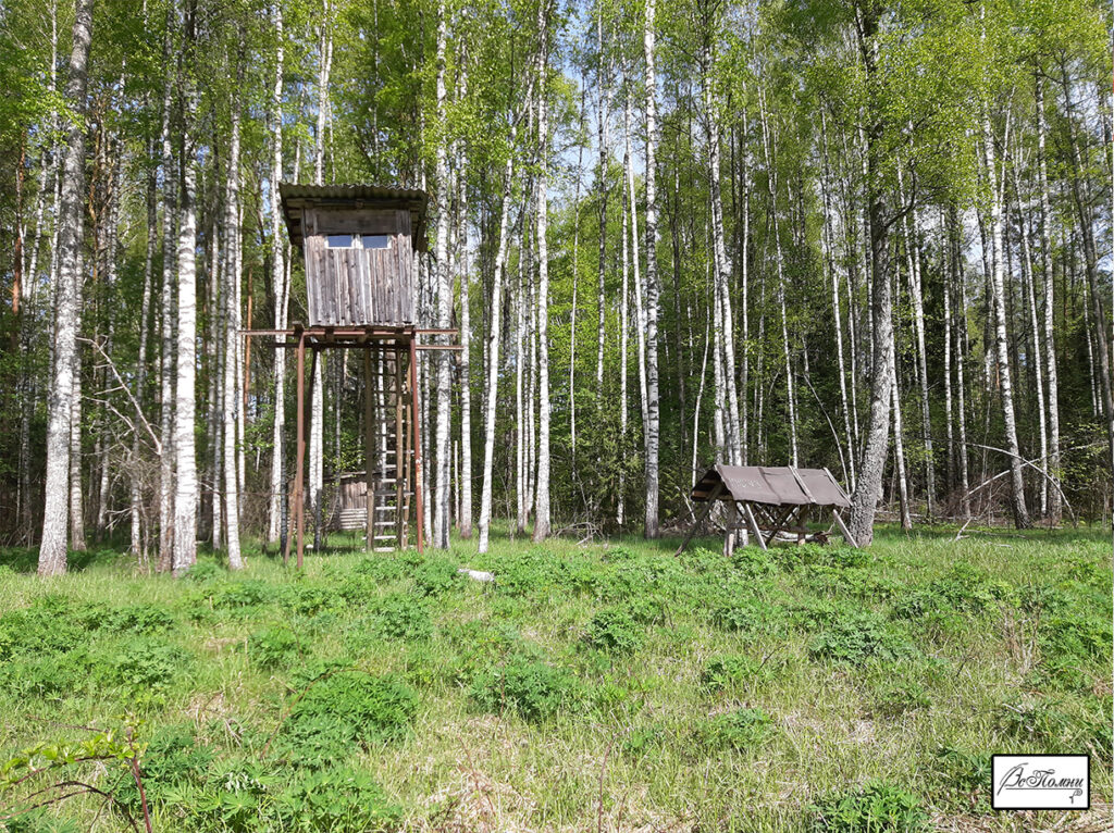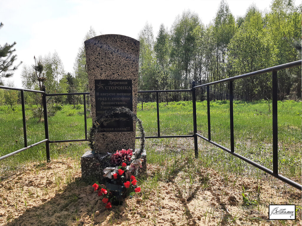 Памятник жителям деревни Сторонка хорошо заметен с дороги. Вокруг поднимается молодой лес. Провели акцию по уборке захоронения, возложили цветы. Чуть в стороне от основной дороги обнаружили небольшой охотничий островок с вышкой, сараем и лосиной кормушкой.