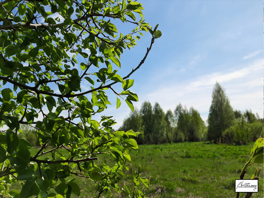 Перебравшись через заболоченный участок, вышли на поле. Среди огромных просторов встречаются отдельные плодовые деревья, напоминающие сады Межного или Славино. Кое-где заметны давние следы пребывания человека: старый корпус холодильника, остатки деревянной охотничьей лестницы.