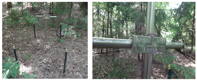 Эту историю еще только предстоит вспомнить. Крест был обнаружен случайно при проведении поисково-этнографического выезда по другому объекту. Он выглядит практически прозрачным, отражая на своей металлической поверхности окружающие деревья. В окрестностях уже много не слышно людских голосов: окрестные деревни Толстый лес, Парщаха и др. были дотла сожжены с жителями и не восстановились. Среди паспортов воинских захоронений крест не значится, по книгам «Память» не найден. В списках жертв войны Осиповичского и Глусского района не упоминается. Вероятно, крест был установлен кем-то из выживших жителей уничтоженных деревень.