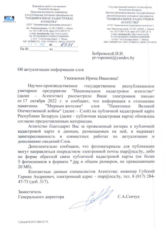 14 ноября 2022 года был получен официальный ответ (№ 6531). Национальное кадастровое агентство выразило заинтересованность в совместных работах по актуализации и дополнению сведений слоя «Памятники Великой Отечественной войны». Участники проекта выражают слова благодарности сотрудникам агентства за внимание и помощь в реализации нашей инициативы. В дальнейшем планируем развивать наше сотрудничество и пополнять Публичную кадастровую карту объектами «забытых историй».