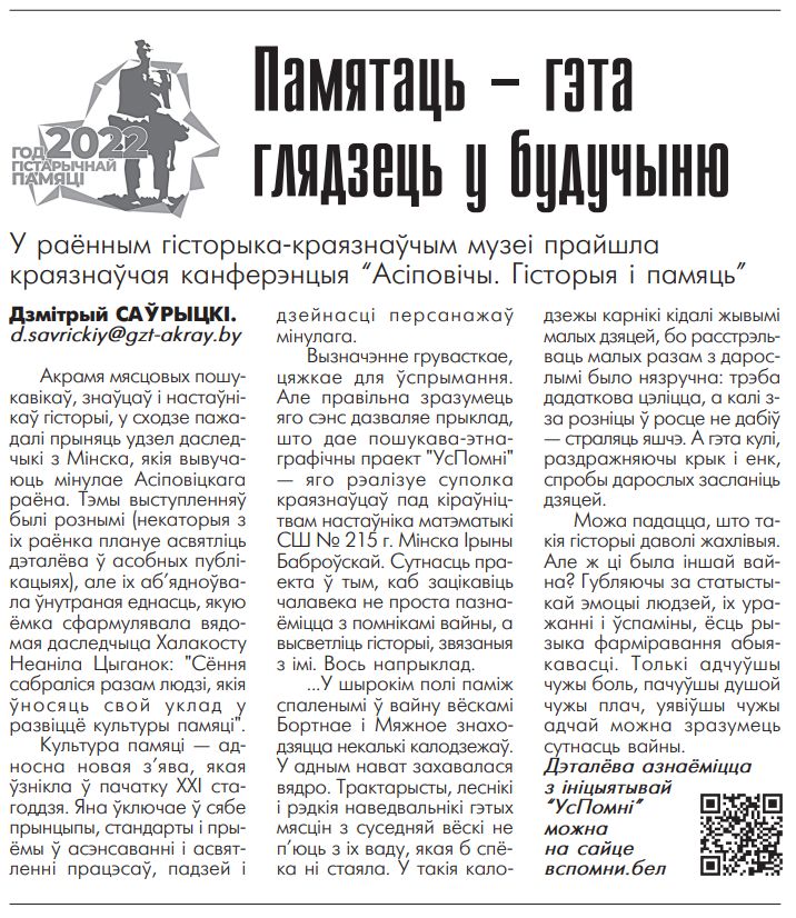29 ноября в газете «Асіповіцкі край» № 93 (10655) Дмитрием Саврицким был опубликован материал о конференции и нашем проекте. Участники проекта выражают благодарность Дмитрию за интересную статью и инициативу к сотрудничеству. Участие в конференции еще раз доказывает, что бояться не стоит. Помнится, полгода назад мы рассматривали «Асіповіцкі край» как перспективное СМИ для сотрудничества, но отправить материалы все не решались. Благодаря Дмитрию Саврицкому контакт был установлен.