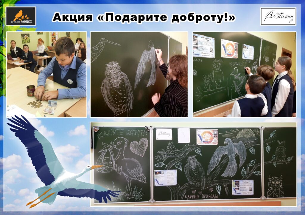 Ребята увидели видеоролик, смонтированный из фрагментов, опубликованных приютом, узнали истории некоторых крылатых подопечных. В знак признательности приюту участники акции нарисовали птичек на доске. В завершении акции учащиеся услышали стихотворение «Небо для аиста», посвященное birdhelp. Всего было собрано 112,25 рублей.