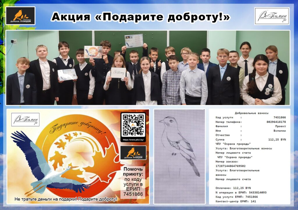 С 7 по 11 октября поисково-этнографическим проектом «ВсПомни» была проведена благотворительная акция «Подарите доброту!». Вместо подарков ко Дню учителя учащимся 6 «Б», 6 «С», 8 «А» и 11 «А» классов средней школы № 215 г. Минска было предложено перевести любую сумму частному учреждению «Охрана природы» или принести копеечки в копилку.