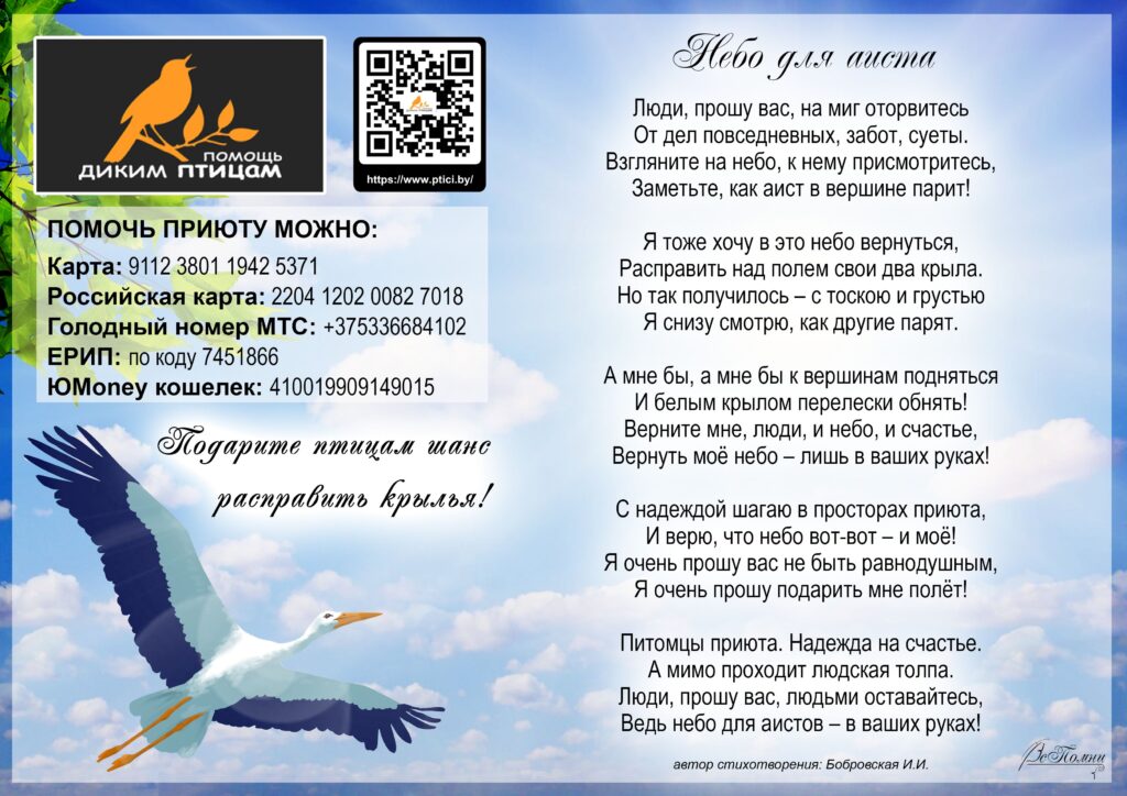 Поисково-этнографический проект «ВсПомни» благодарит «Охрану природы» за помощь диким птицам, заботу и отзывчивость к подопечным, а также приглашает неравнодушных оказать посильную помощь приюту: https://www.ptici.by/.